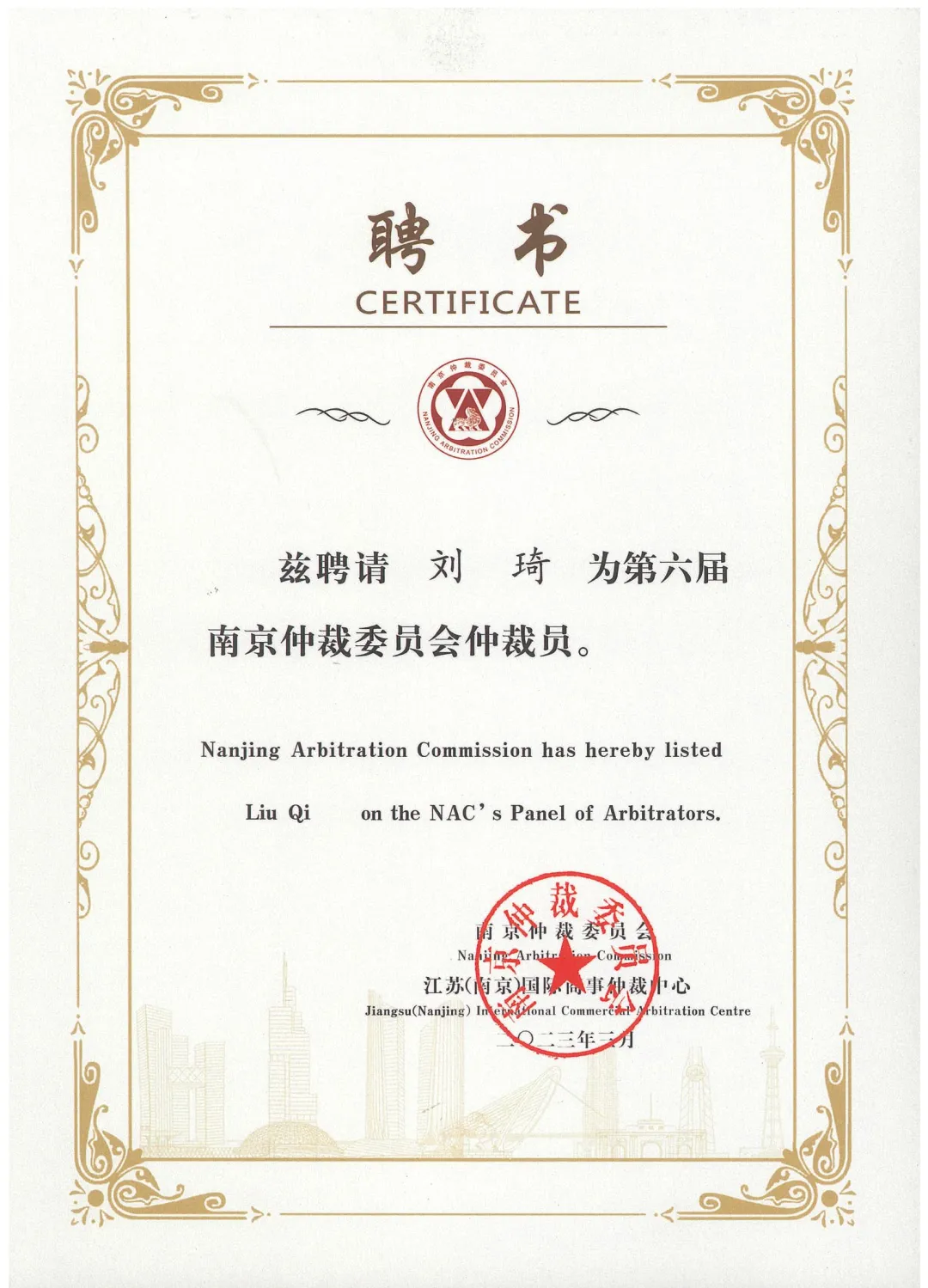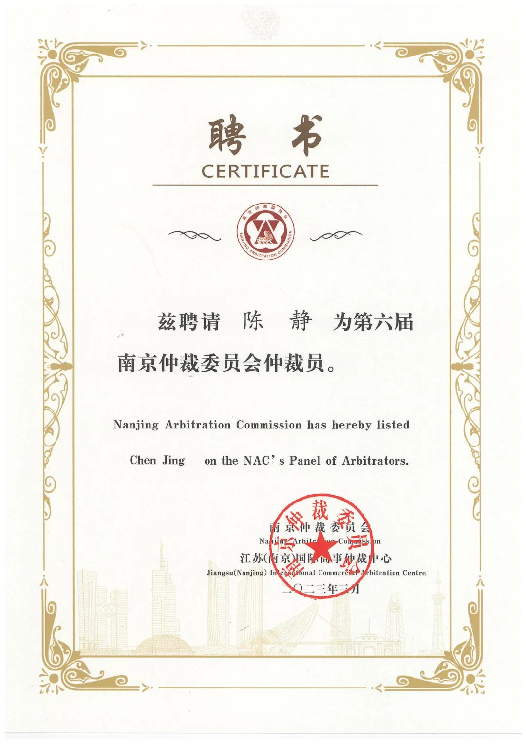 Ms. Jing Chen and Mr. Qi Liu were appointed as Arbitrators to 6th Nanjing Arbitration Commission