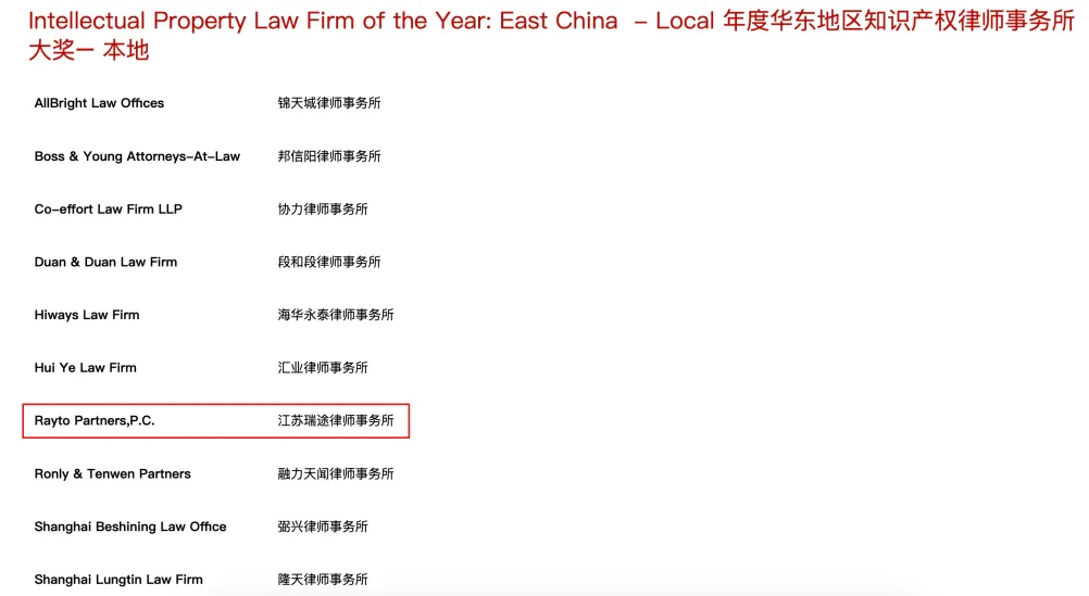 Rayto shortlisted for 2024 ALB "Intellectual Property Law Firm of the Year: East China - Local