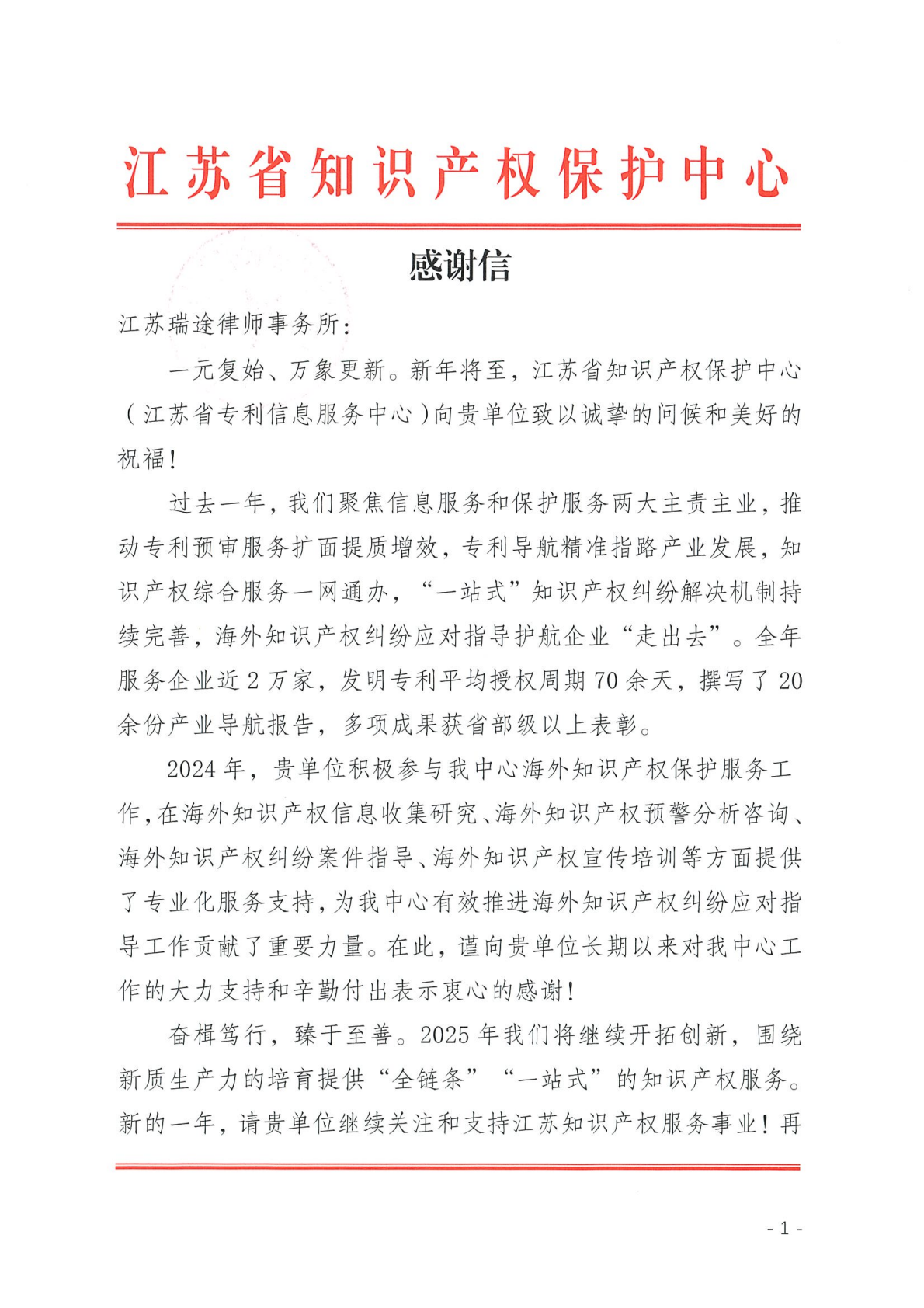 As time goes by, the clouds fade away, and the beauty of the world shines new day by day. At this beautiful moment of the transition between old and new, and the renewal of everything, many units and institutions such as Jiangsu Intellectual Property Protection Center, Jiangsu Science and Technology Resource Coordination Service Center, Anhui Innovation Center Service Management Center, Open Atomic Open Source Foundation, etc. have sent thank-you letters to Rayto Law Firm and its director Jiang Haijun, deputy director Chen Jing, senior partner Li Weichao, and retrieval consulting department head Wu Xuejian.