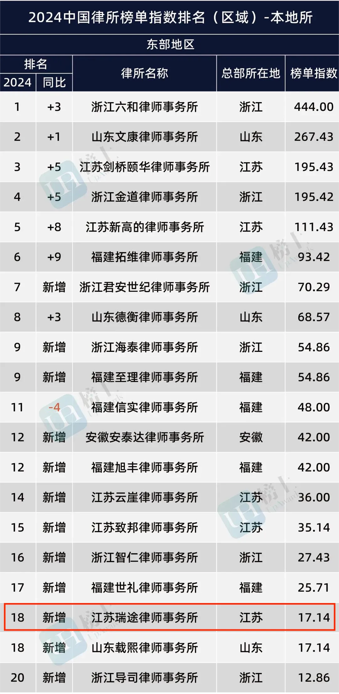 On January 7th, Zhihe released the "2024 China Law Firm Ranking Index (Regional Law Firms)", and Jiangsu Rayto Law Firm was selected for the first time, ranking 18th among local law firms in the eastern region of the list.