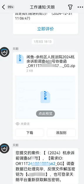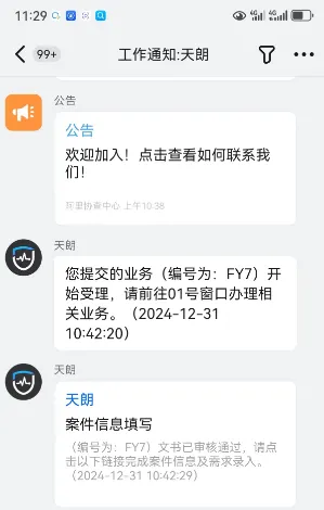 According to the detailed instructions of the route guide, find the handling window. First, scan the QR code with WeChat to download DingTalk. Fill in the relevant information and get a number. Wait for the staff at the window to call the number. The staff will push a link through DingTalk. Upload materials such as the statement of claim, lawyers' practicing certificates (for two lawyers), and the court's investigation assistance letter as required by the link. Then, wait for the staff to review. After the review is correct, you can go back and wait for the entity information pushed by DingTalk. Generally, the information that needs to be disclosed can be received within three to five working days. Figure 1 is a screenshot of the DingTalk notification interface when we went to the site for disclosure on December 31, and Figure 2 is the disclosed information received on January 3. The efficiency is relatively high.