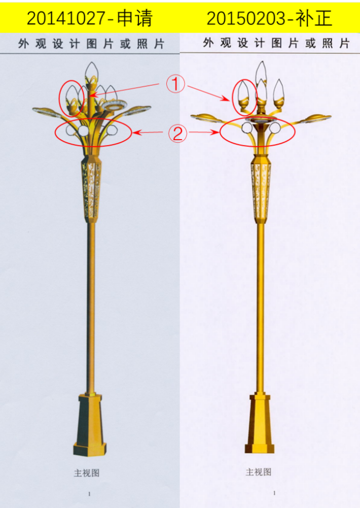 In this case, as shown in the figure below, the modified image submitted by the patent in question on March 12, 2015 has two differences from the original application document image: ① the graphic of the lamp holder is different; ② An inverted conical platform has been added to the lower part of the central lamp post.