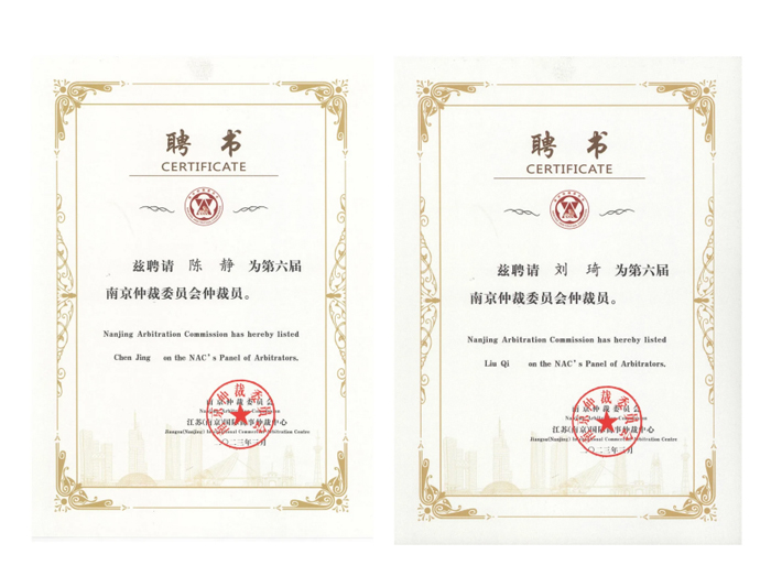 Ms. Jing Chen and Mr. Qi Liu were appointed as Arbitrators to 6th Nanjing Arbitration Commission