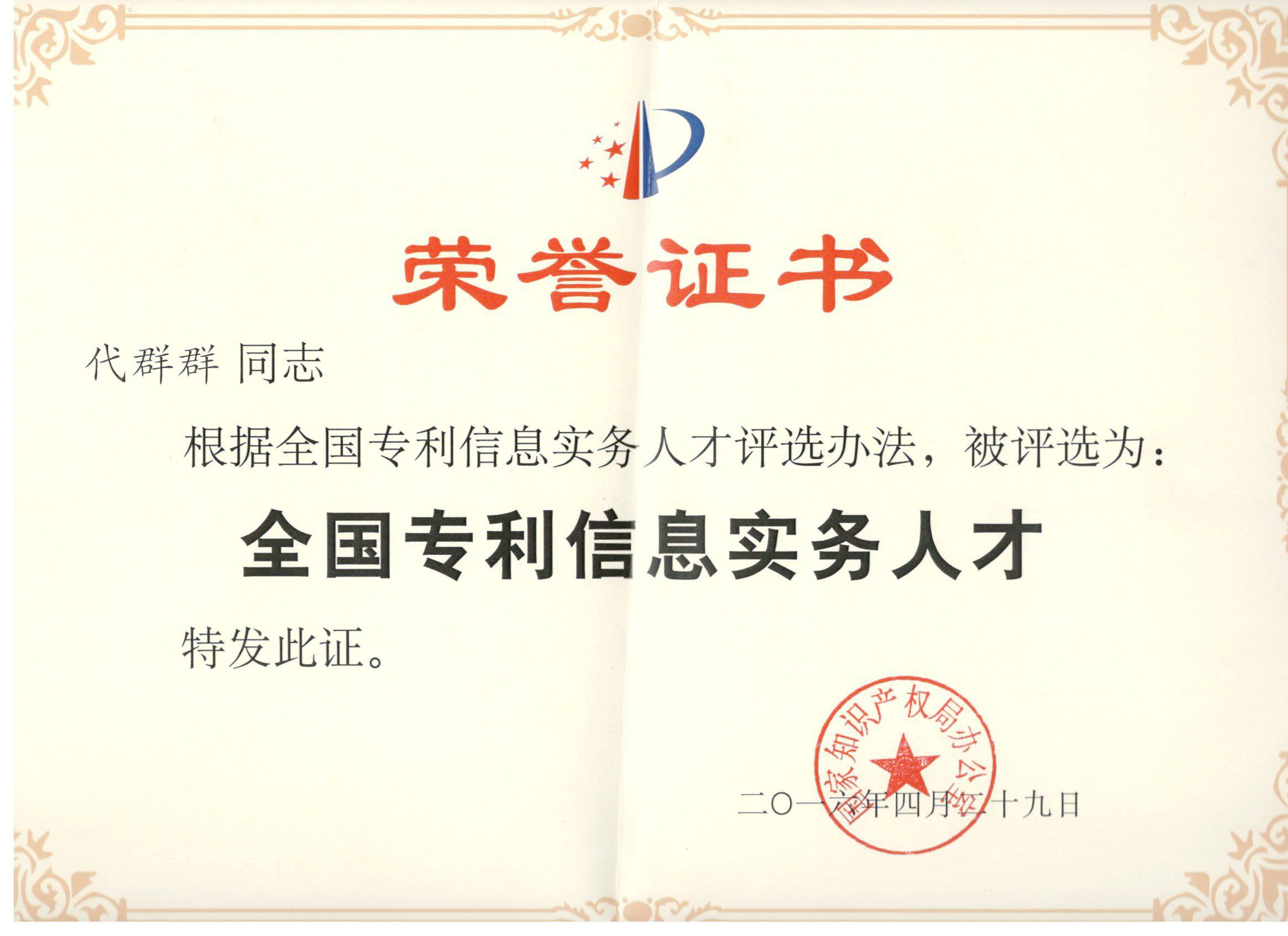Ms. Qunqun Dai designated as First-Cohort National Patent Information Specialist